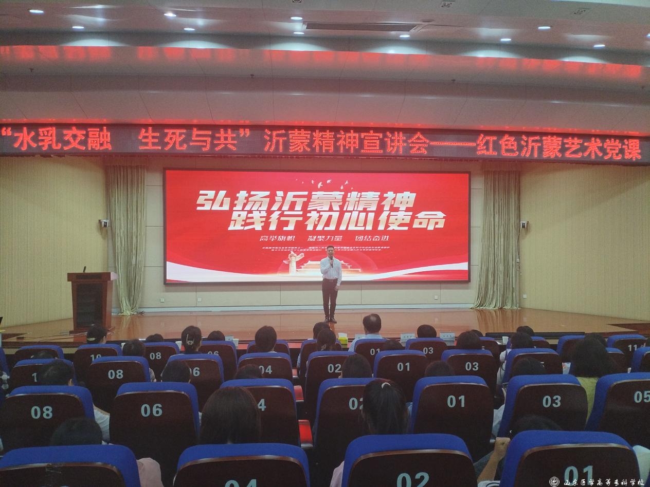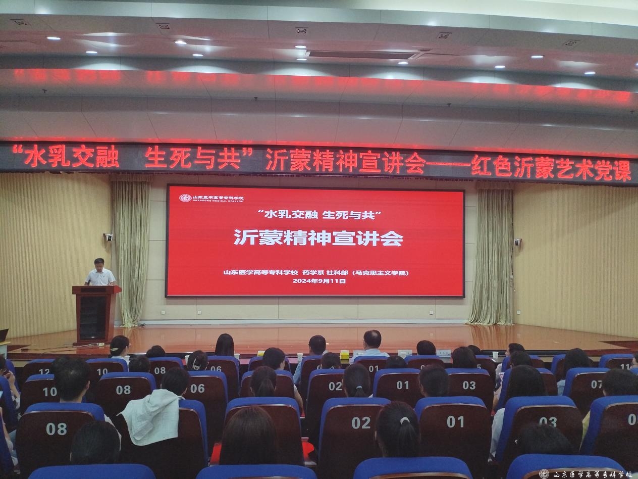 9月11日,我校特邀中共临沂市委党校鲁南制药集团分校沂蒙精神宣讲团进校开展“水乳交融,生死与共”沂蒙精神宣讲会——“红色沂蒙”艺术党课。学校党委副书记高曰超、鲁南制药集团人力资本中心主任周冰出席活动,有关部门负责同志和药学系2024级新生600余人观看演出。本次活动由药学系联合社科部(马克思主义学院)联合承办。