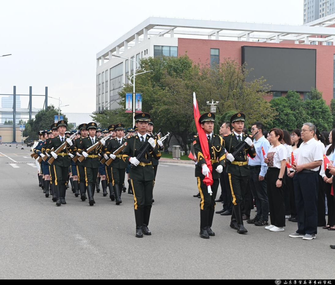 9月30日,山东医学高等专科学校举行“七十五载逢盛世 同心共筑谱华章”升旗仪式,庆祝中华人民共和国成立75周年,向伟大祖国致敬。学生工作处(武装部)负责人、各系部党总支副书记及师生代表参加升旗仪式。