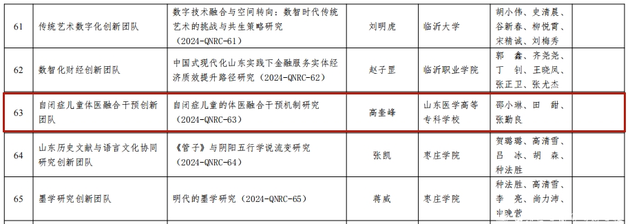 近日,山东省社会科学界联合会公布第四批山东省哲学社会科学青年人才团队名单,山东医学高等专科学校“自闭症儿童体医融合干预创新团队”名列其中,同时配套立项山东省社科联人文社会科学课题(青年人才专项)。