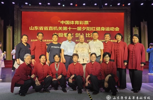 7月23日,山东省省直机关第十一届夕阳红健身运动会太极拳比赛在省老干部活动中心举办,山东医专济南校区八名离退休老同志代表省卫生健康委参加比赛,荣获优胜奖。省卫生健康委离退处处长陈宪钧、离退处一级调研员夏继忠,学校党委委员、副校长程智军同志出席活动。