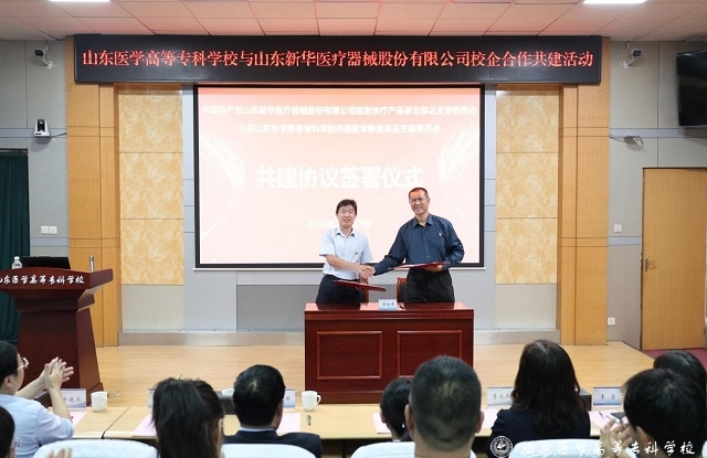 10月17日,山东医学高等专科学校与新华医疗器械股份有限公司在学术报告厅联合举办主题为“理论联学、活动联办、业务联动、组织联建、品牌联创”的校企共建活动。新华医疗器械股份有限公司放射诊疗产品事业部党总支书记、副总经理任旗,国家级技能大师工作室领衔人、全国五一劳动奖章获得者、特级技师姚海涛,学校党委书记舒德峰,党委委员、副校长伊芃芃,学校教务处、实践教学与招生处相关负责人及医学影像系全体教师和学生代表参加活动。
