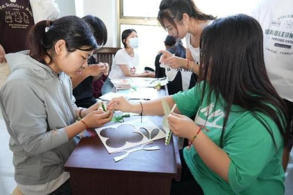 活动伊始,学工助理向同学们介绍了端午节的来历,并讲解了诸如挂艾草、佩香囊、赛龙舟、吃粽子等端午节传统习俗。书画社成员带领同学们现场做手工,展书画,她们用手中的剪刀和材料裁剪出一个个美丽的图案,拼制出许多惟妙惟肖的粽子、龙舟形象,引人称赞。
