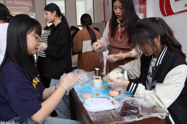 活动伊始,工作室老师向同学们介绍了国庆节、中秋节的历史由来和相关习俗,简单介绍了月饼的起源及制作方式,并提前为同学们送上了中秋佳节的祝福。随后,糕点师傅和学生摆好材料,开始制作月饼。软韧弹嫩的冰皮,各式各样的馅料,有清雅香甜的豆沙,甜而不腻的枣泥,唇齿留香的五仁,浓香四溢的板栗……在糕点师傅的带领下,同学们认真了解制作月饼的步骤和食材的搭配,掌握制作月饼的操作流程,揉面成团、擀开月饼皮,包上饱满馅料,压模成型,再进行装盒。学生们忙得不亦乐乎,体验制作的乐趣,活动室内充满欢声笑语,营造出浓厚的节日氛围。活动后,同学们将做好的月饼分享给老师和同学,共同体会温情温暖,度过一个浓情四溢的中秋佳节。