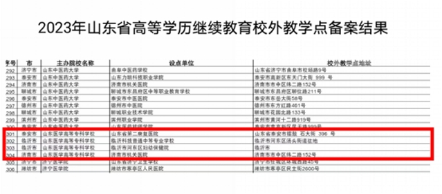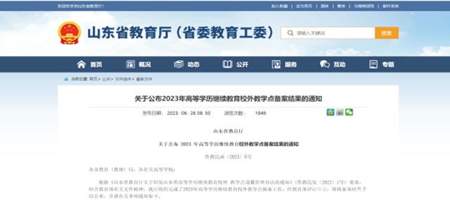根据山东省教育厅《关于公布2023年高等学历继续教育拟招生专业备案结果的通知》(鲁教民函〔2023〕9号)和《关于公布2023年高等学历继续教育校外教学点备案结果的通知》(鲁教民函〔2023〕8号),现将我校2023年高等学历继续教育校外教学点名单备案结果公示如下: